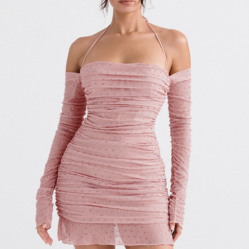 Valentina - Damska Mini Sukienka Off-Shoulder z Plisowaniem i Strassami