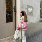 Ten wygodny sweter z szerokimi paskami to niezbędny element w swobodnej i modnej stylizacji. Miękki, luźny krój oraz oversize'owe rękawy zapewniają relaksujący, a jednocześnie stylowy wygląd. Idealny na chłodne dni lub przyjemny spacer po mieście, a wyraziste paski nadają Twojemu wyglądowi zabawny akcent.