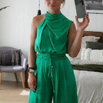 Zestaw Dana emanuje klasą dzięki luznemu krojowi. Top bez rękawów ma korzystny dekolt na halter, podczas gdy spodnie z szerokimi nogawkami oferują komfort i styl. To idealna stylizacja na wieczorne wyjście.