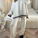 • Materiał: Miękka, dzianinowa tkanina, która zapewnia ciepło. Uwaga: beżowe spodnie mogą być nieco przezroczyste, ale dzięki długiemu swetrowi nie widać tego :)