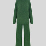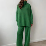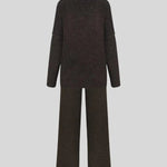 Zestaw dzianinowy Elina to idealne połączenie komfortu i ponadczasowej elegancji. Luźny krój oraz wysoki dekolt nadają całości stylowy, swobodny charakter. Komplet składa się z miękkiego swetra oraz spodni z szerokimi nogawkami, które zapewniają ciepło i wygodę w chłodniejsze dni. Przyjemny w dotyku materiał sprawia, że zestaw doskonale sprawdzi się zarówno podczas relaksu w domu, jak i na niezobowiązujące wyjścia.